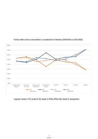Forbice delle carriere universitarie e accademiche in Unimore (2018/2019 vs 2021/2022) Legenda: Grade A: PO; Grade B: PA; Grade C: RTDb+RTDa+RU; Grade D: Assegnisti/e 12